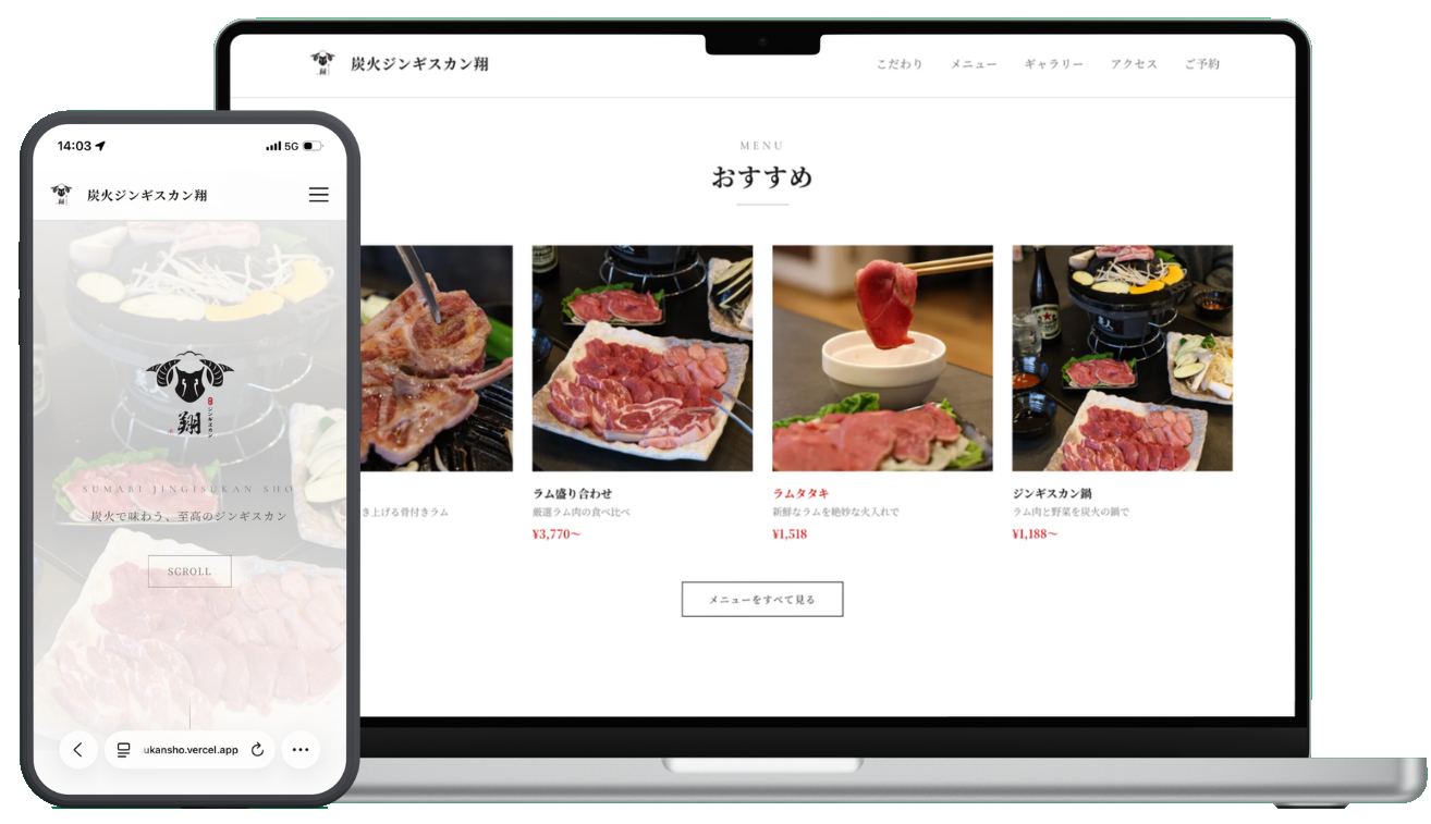 奈良県橿原市の炭火ジンギスカン専門店。食べログ・Instagramの情報をもとに、店舗の魅力を伝える公式サイトを制作。ギャラリー・メニュー・アクセス・予約導線をワンページに集約しました。